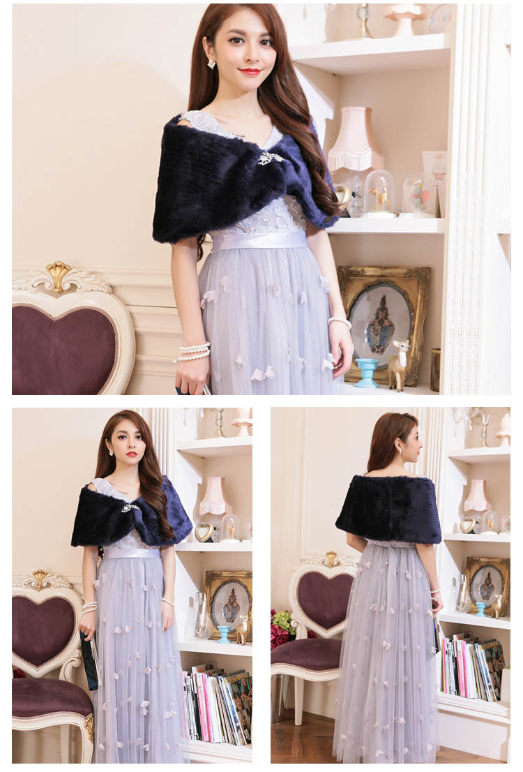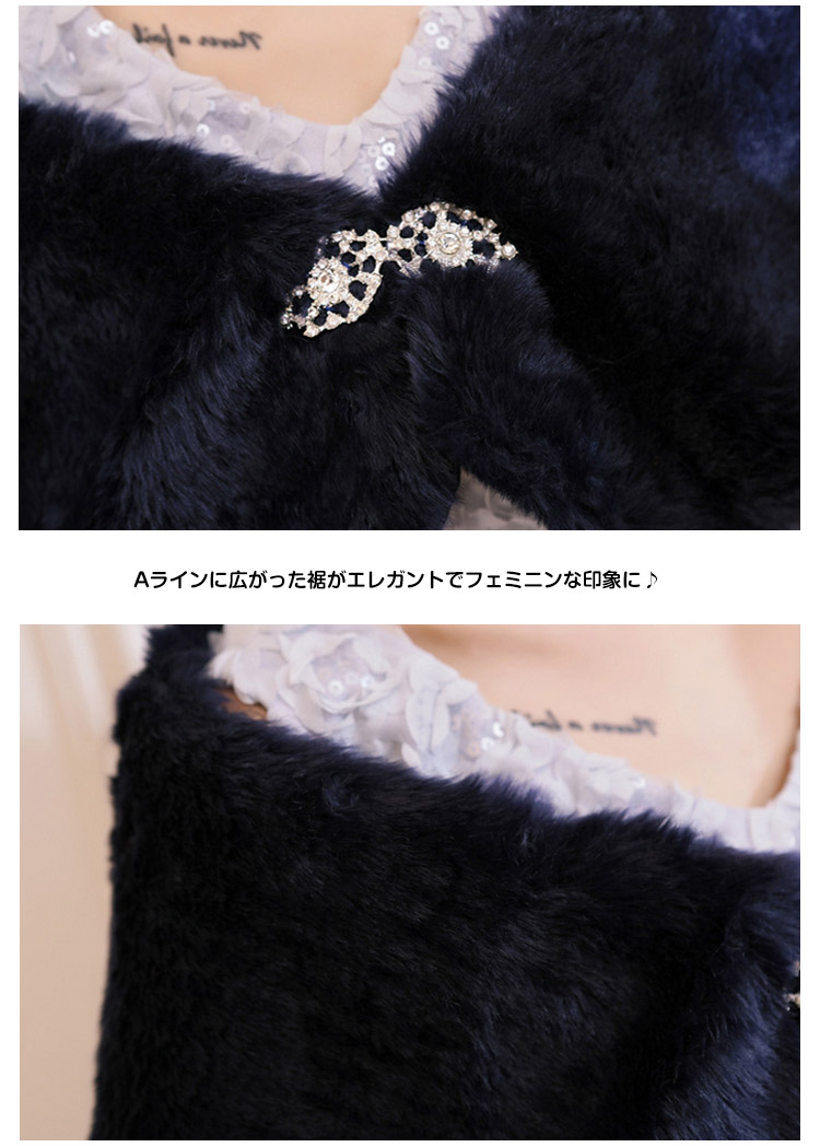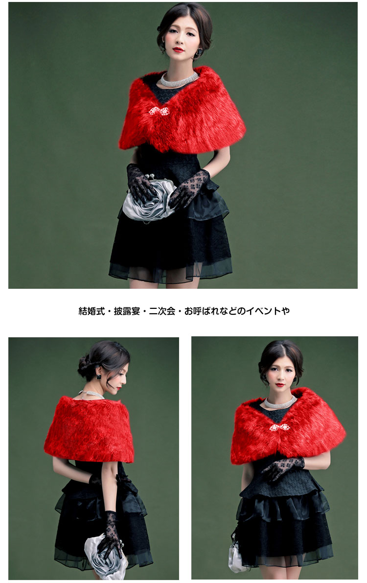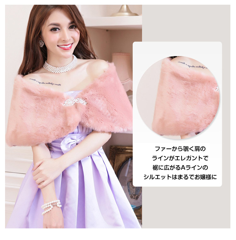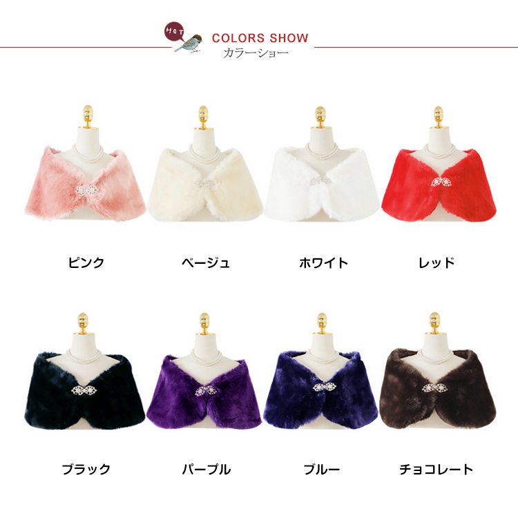 | 手触りが良い、ラインストーンのブローチ付きファーボレロ。柔らかでふんわりした上質のファーはつややかで保温性もばっちり◎Aラインに広がった裾がエレガントでフェミニンな印象に♪キラキラ輝くラインストーンが素敵なアクセントになっています。結婚式・披露宴・二次会・お呼ばれなどのイベントやフォーマルなドレスシーンだけでなく、卒業式・謝恩会といった和装にもオススメの1枚です。 | |
