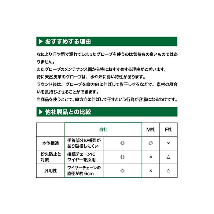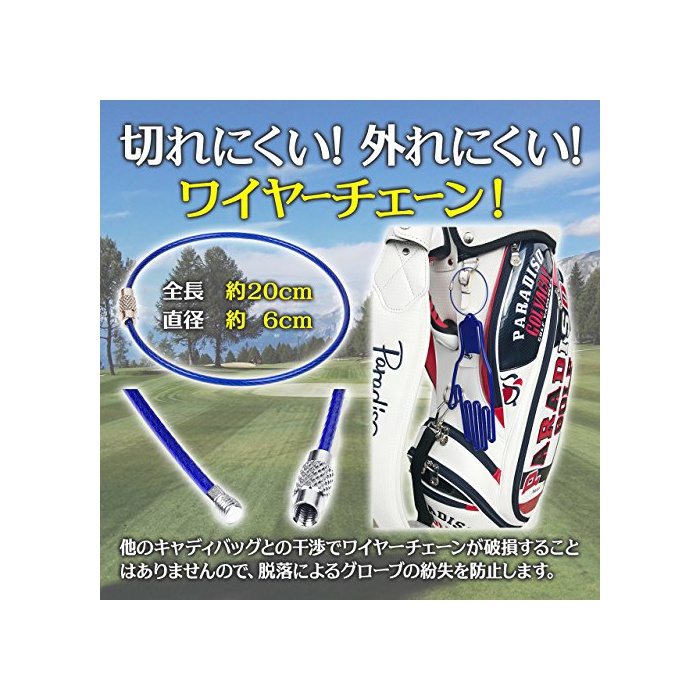 금속 체인과 차이,망가져 어려운 와이어 체인.마스터실에서 카트에 캐디 백을 태울 수 있는 시,내려놓아지는 시,택배로 운반되는 시,다른 캐디 백등과 간섭 하는 것으로 금속 홀더가 파손하고, 행거 글로브마다 탈락하는 케이스가 있습니다.와이어 체인은 이러한 탈락에 의한 글로브의 분실을 방지에 옵니다.
