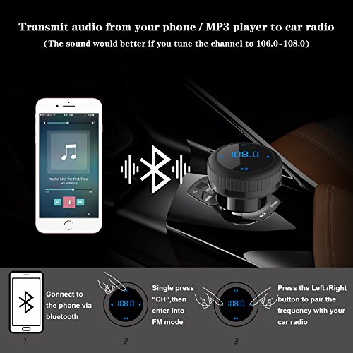 【FM Transmitter Radio Adapter】 wirelessly stream high quality audio to the car FM stereo system via Bluetooth connection to compatible devices. You can also insert U disk or micro SD card to play MP3 files. FM 87.5-108.0MHz full channels covered.(The sound would be better if you tune the channel to 106.0~108.0, also please turn on your phone’s volume to the loudest for high quality sound)