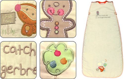- Feature : This cream baby sleeping bag features a cheeky little fox trying to chase a gingerbread man. / The embroidered words '...you can't catch me! I'm the gingerbread man!' appear on the chest. / The sleeping bag is trimmed with orange gingham material. Ideal for any little boy or girl! / Material Composition : 100% cotton lining, 35% cotton/65% polyester outer, 100% polyester padding / 2.5 Tog baby sleeping bags are suitable for all year round, except peak summer temperatures. For use with room/nursery temperatures between 60°F and 70°F.