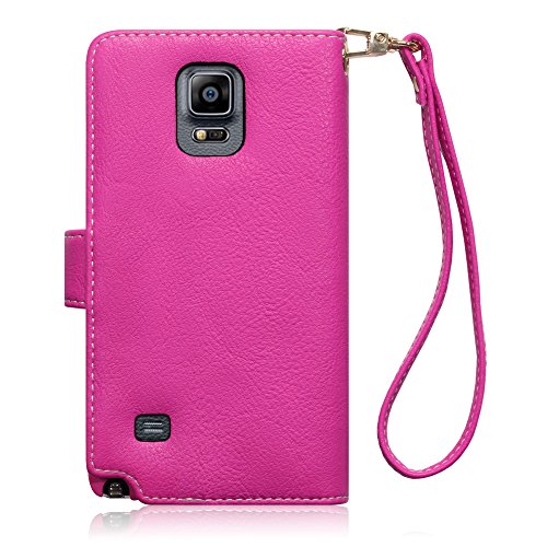 - Feature : Stylish Textured Leather Wallet Case for Samsung Galaxy Note 4 / Magnetic closure for added security / Card Slots, cash compartment and detachable wrist strap / Hard rubberized inner shell for added device protection / Colour: Hot Pink with Lily Floral Textile Interior