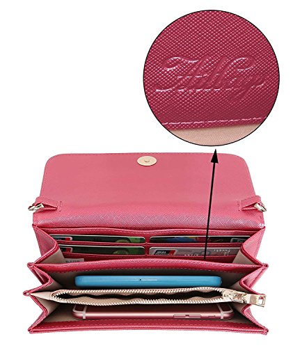 FUNCTION: This cute leather purse has slim carryall functions as a wallet, clutch and crossbody in one with 3 main compartments for your phones, paper money , key, 4 card slots, 1 slip pocket for receipts and 1 zipper pocket for coins