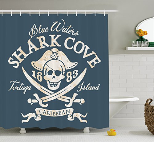 Pirate Shower Curtain by Ambesonne, Shark Cove Tortuga Island Caribbean Waters Retro Jolly Roger, Fabric Bathroom Decor Set with Hooks, 75 Inches Long, Slate Blue White Light Mustard