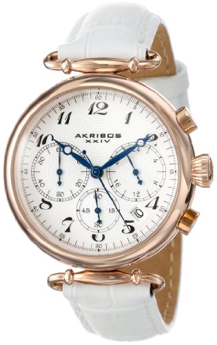 -. Feature : Elegant and feminine, this Akribos XXIV timepiece features luxurious white leather paired with rose-tone stainless steel. / Japanese Quartz movement with analog display / Features protective mineral crystal dial window, date window at 4:30 / Chronograph includes 60-second and 60-minute timers and GMT (24-hour) subdial / Water resistant to 165 feet (50 M): suitable for swimming and showering