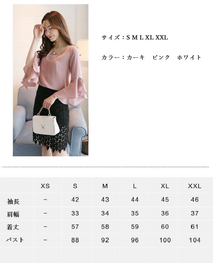 素材】:シフォン【カラー】:ホワイト,ピンク、グリーン【サイズ】着丈:57cm(S) 58cm(M) 59cm(L) 60cm(XL) 61cm(2XL) バスト:88cm(S) 92cm(M) 96cm(L) 100cm(XL) 104cm(2XL) 袖丈:42cm(S) 43cm(M) 44cm(L) 45cm(XL) 46cm(2XL) 肩幅:33cm(S) 34cm(M) 35cm(L) 36cm(XL) 37cm(2XL)