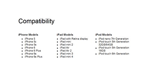 Compatible with iPhone 5, 5c, 5s, SE, iPhone 6, iPhone 6 Plus, iPhone6s, iPhone6s Plus, iPod Nano 7, iPod Touch 5, iPad 4, iPad Air, iPad Air 2, iPad Pro, iPad Mini Retina, iPad Mini, iPad Mini3, iPad mini4