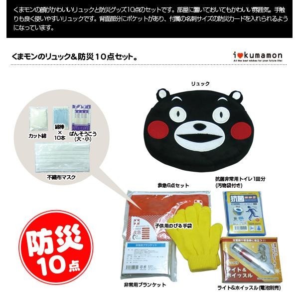 くまモンの顔がかわいいリュック&防災グッズ10点のセットです。背面部分にはポケットがあり、付属の防災カードを入れられます。 |