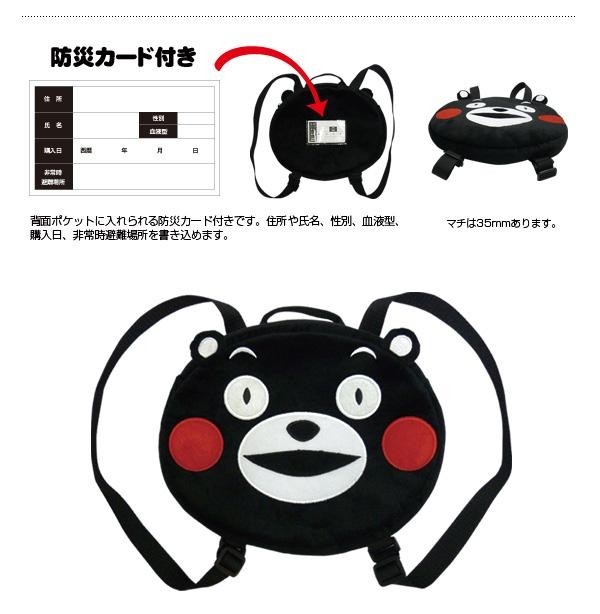 | くまモンの顔がかわいいリュック&防災グッズ10点のセットです。背面部分にはポケットがあり、付属の防災カードを入れられます。 |