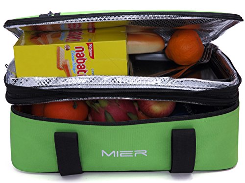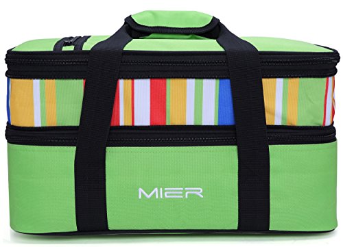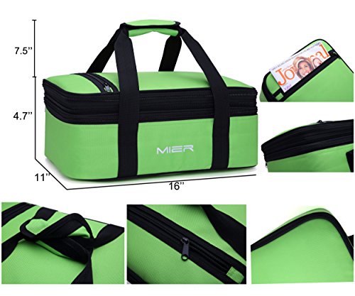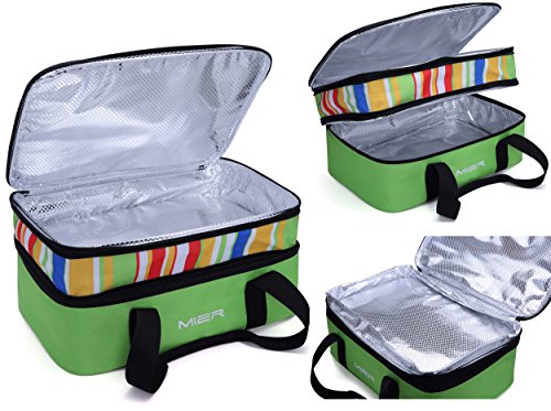 MIER expandable lunch bag has 2 large compartments; Expandable upper compartment size: 16x11x3.2inch, Bottom compartment size:16x11x4.2inch, accommodate most 9" x 13" baking dishes (dished not included)