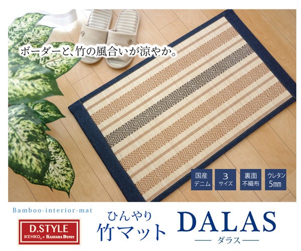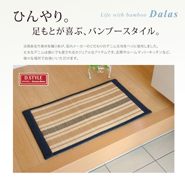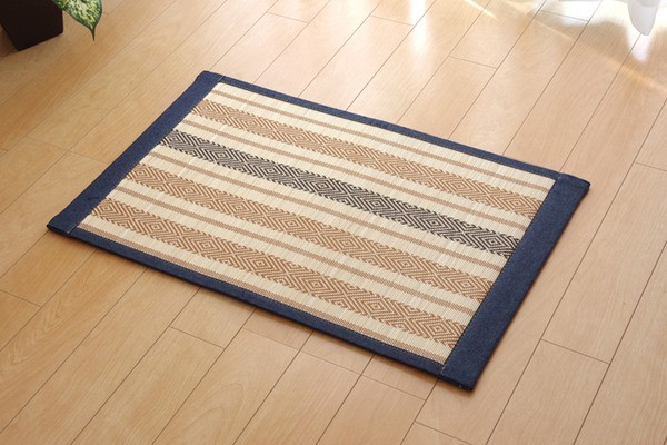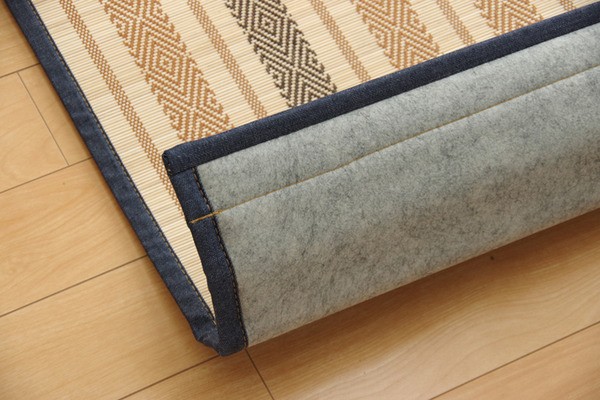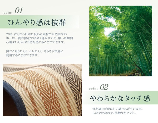 シンプルなデザインで夏にぴったりの敷きやすいバンブーラグです。竹は耐久性に優れ、熱伝導率が高いため自然のひんやり感があります。縦糸にカラー糸を使用し柄を出したデザイン織りの商品です。裏には不織布を貼っていますので、フローリングでのご使用に適しています。竹は他の木材と比べると、格段に成長が早く(3~5年で成竹)、持続的生産が可能な環境に優しいサスティナブルな素材です。