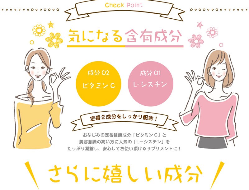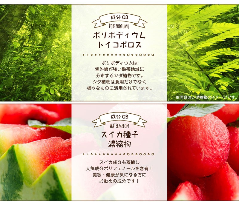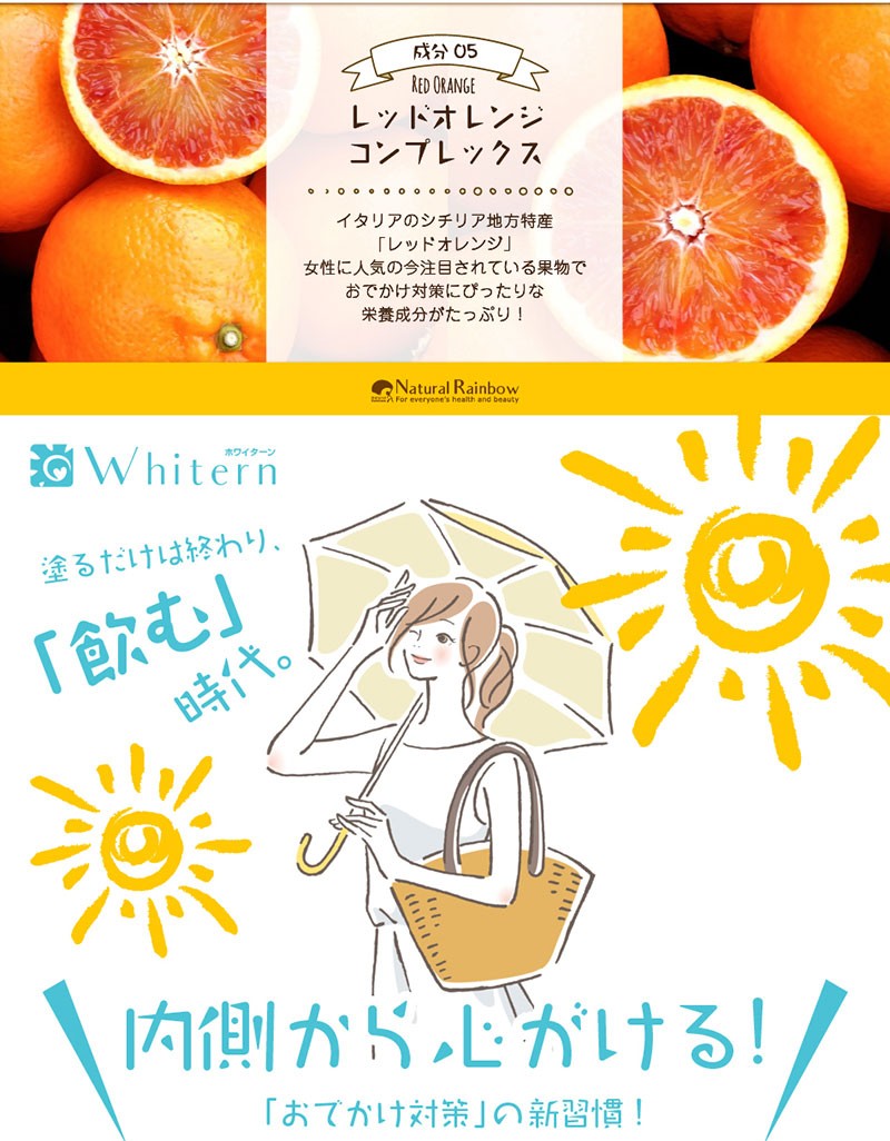 | 原材料名 | ポリポディウムロイコトモスエキス末(ポリポディウム・レウコトモス抽出物、マルトデキストリン)、乳糖、レッドオレンジ抽出物(レッドオレンジ抽出物、マルトデキストリン)、デキストリン、ナタネ硬化油、スイカ種子抽出物/L-シスチン、ビタミンC、結晶セルロース、HPC、ステアリン酸カルシウム、微粒二酸化ケイ素、(一部に乳・オレンジを含む) |