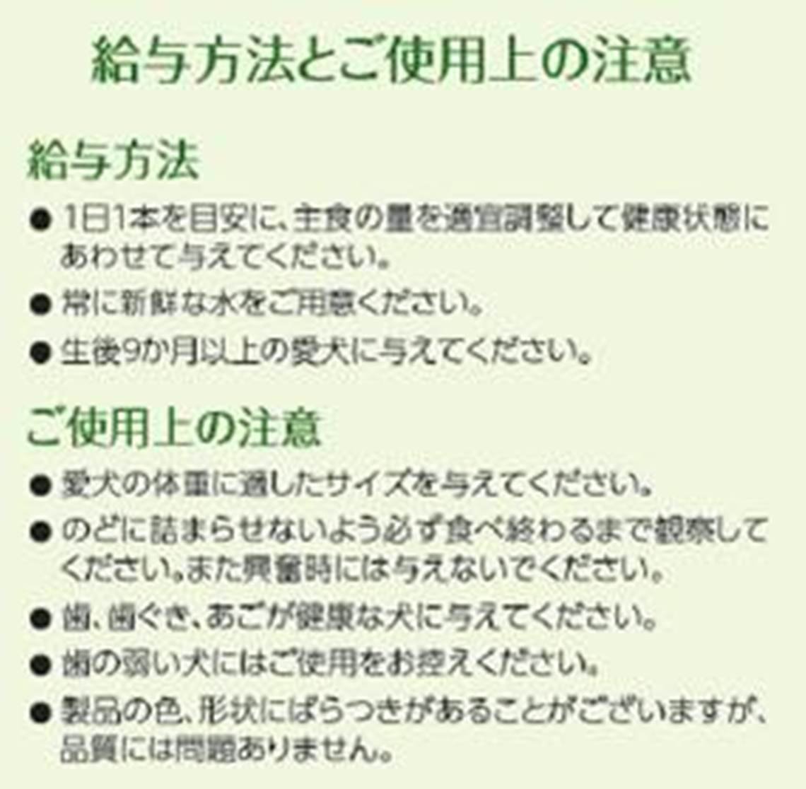 ●愛犬の体重に適したサイズを与えてください。●のどに詰まらせないよう必ず食べ終わるまで観察してください。また興奮時には与えないでください。●歯、歯ぐき、あごが健康な犬に与えてください。●製品の色、形状にばらつきがあることがございますが、品質には問題ありません。