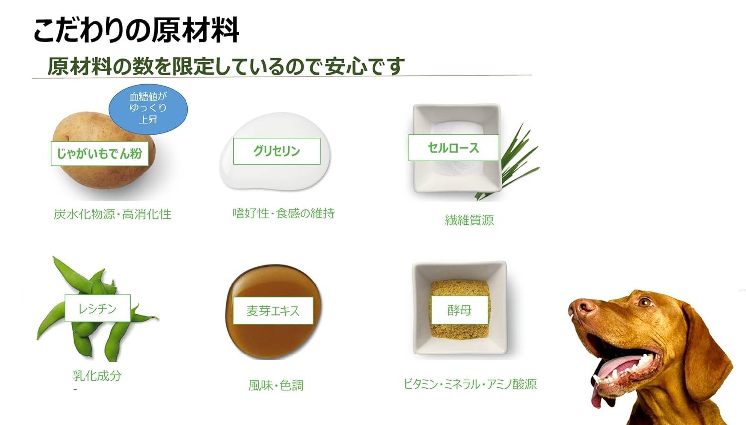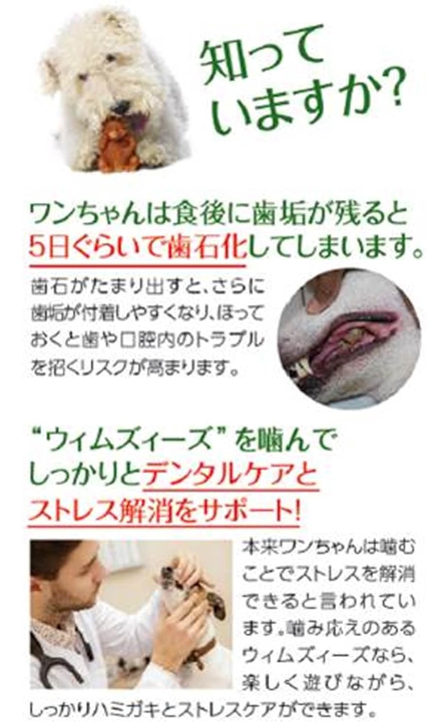 ウィムズィーズは厳選自然素材を使用したデンタルトリーツです。独特の形状と噛み応えで、楽しく長く噛むことが出来ます。限定した自然由来の原材料を使用し、原材料の数も限定しています(主要原料6種類)。小麦やトウモロコシなどの穀物を一切使用していません(グレインフリー)。長く噛むことにより、歯垢や歯石の減少、口臭予防にも役立ちます。人工着色料、香料、合成保存料不使用。