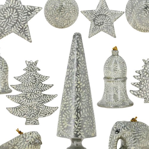 - Title : Set of 11 Silver Paper Mache Christmas Ornaments - Handmade Indian Gifts