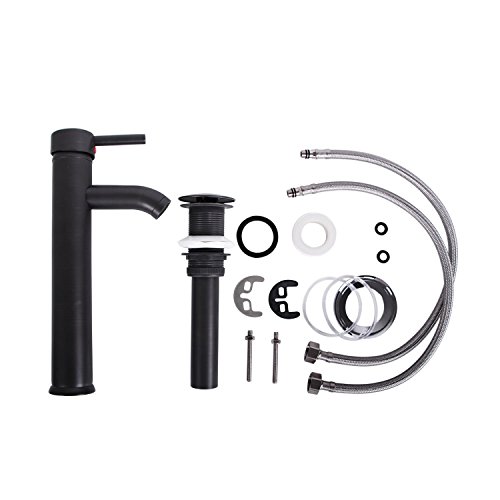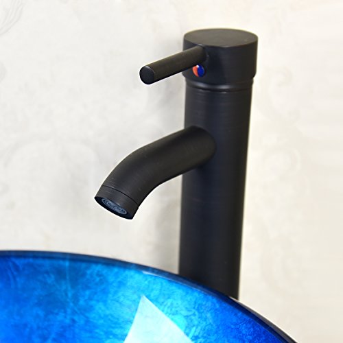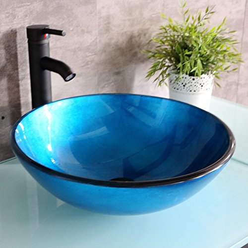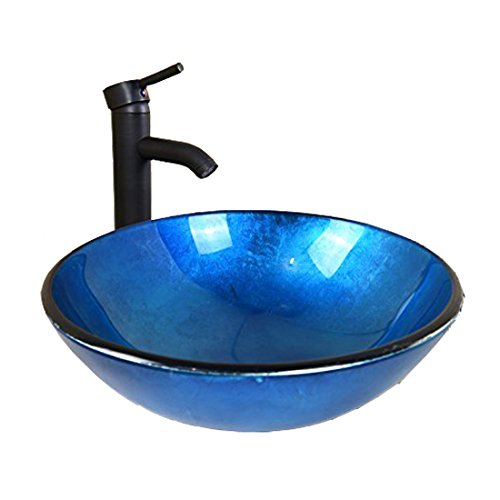 WALCUT Bathroom Jewelry Modern Round Artistic Glass Vessel Sink with Oil Rubbed Bronze Faucet and Pop-up Drain Combo, Blue