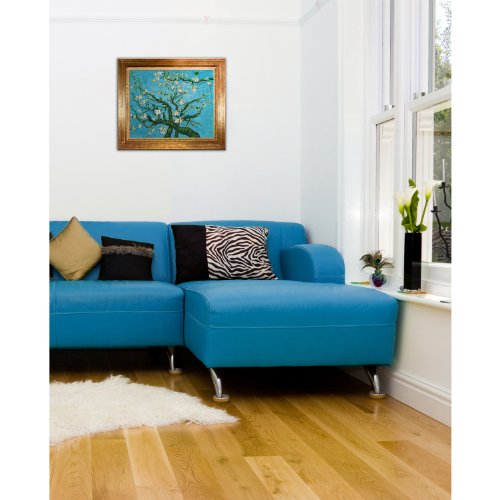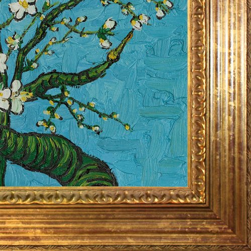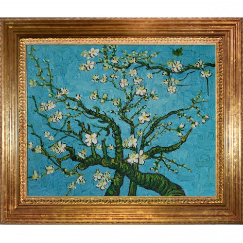Hand painted oil reproduction of a famous Van Gogh painting in an artists interpretation, Branches of an Almond Tree in Blossom. The original masterpiece was created in 1890. Today it has been carefully recreated detail by detail, color by color to near perfection. Van Gogh created this painting as a gift for his newborn nephew. The way he made is brush strokes were fitting to the baby because he combined a sense of fragility and energy. A joyous and hopeful image for the child's future. Vincent Van Gogh's restless spirit and depressive mental state fired his artistic work with great joy and, sadly, equally great despair. Known as a prolific Post-Impressionist, he produced many paintings that were heavily biographical. This work of art has the same emotions and beauty as the original. Why not grace your home with this reproduced masterpiece. It is sure to bring many admirers, Frame Description Vienna Wood Frame Gold Leaf Finish.Feature