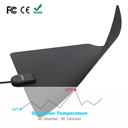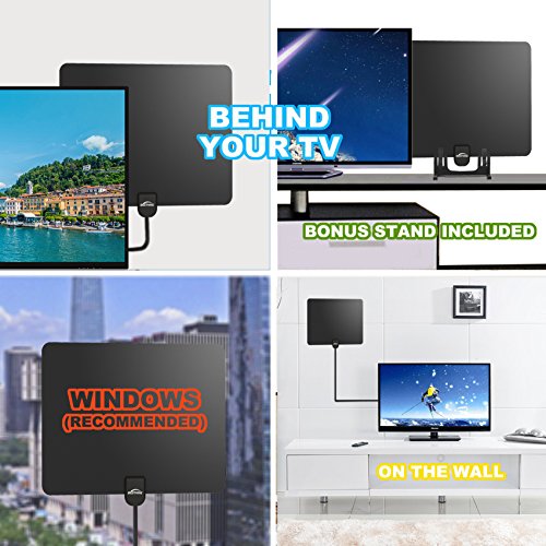 Features 1. Reception up to 50 miles - Best indoor antenna for big city 2. 1080p High Definition and Ultra 4K Ready 3. Omni-directional reception pattern 4. Multiple set-up options 5. Get all your local channels in stunning HD quality for free 6. As thin as a razor blade, less than a penny thickness 7. Powerful high gain amplifier included 8. Includes a 13 ft. RG6 coaxial cable 9. Hides completely behind your TV 10. Suitable for home and RV use