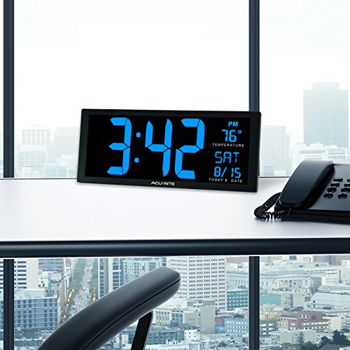 The AcuRite oversized blue led clock with indoor temperature, date and fold-out stand, 14.5" is perfect for any home, office or classroom. Also a great calendar clock for seniors or the visually impaired. The extra-large day clock's screen features bold, cool blue, 4.25-Inch tall, easy-to-read numbers. Displays today's date and current indoor temperature. This clock is powered by a 9-foot power adapter and features cord storage to secure excess cord. Integrated keyholes for easy wall-mounting and sits upright for tabletop use with its fold-out stand. Limited one-year warranty. It's more than accurate, it's AcuRite.Feature