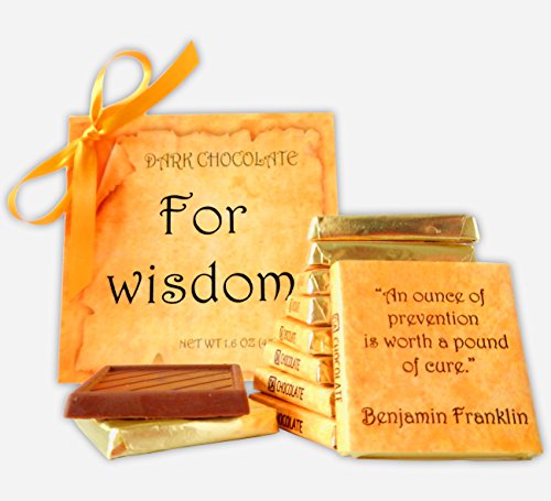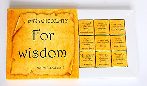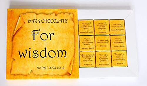-. Feature : Contains 9 pieces of tender dark chocolate made from high quality raw / Arrives ready to give in a creative carton box / Greatest philosophers of all times are here to share their wisdom with you / Each of the 9 wrappers contains wise philosophical quotes like: "The only true wisdom is knowing you know nothing" - Socrates / «An ounce of prevention is worth a pound of cure», «He who will not economize will have to agonize», «Don't forget to love yourself», «There's more to life than increasing it's speed», «A path is made by walking on it», «It's only hard until it becomes easy», «Life is really simple, but we insist on making it complicated», «Think before you speak, read before you think»