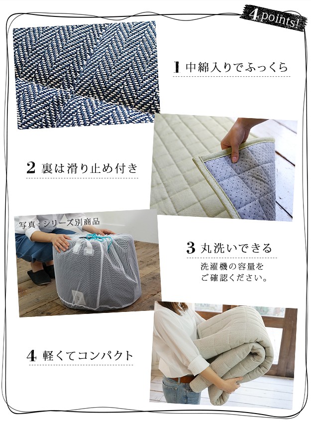 ※メーカー直送のため代金引換はお受けできません。※沖縄・一部離島は別途送料がかかります。お見積もりいたしますのでお問い合わせ下さい。【カラーバリエーション】アイボリー・グリーン・ブルー【仕様】本体:ポリエステル100%裏面:不織布(滑り止め加工)中綿:ポリエステル100%【サイズ】約185x130cm重量:約2kg株式会社ナカムラ(33100076)