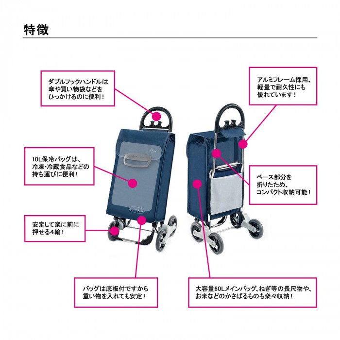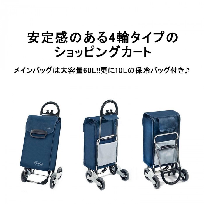 | 安定感のある4輪タイプのショッピングカート☆メインバッグは大容量60L!!更に10Lの保冷バッグ付き♪ベース部分を折りたためるので、使わない時はコンパクトに収納できます。 |