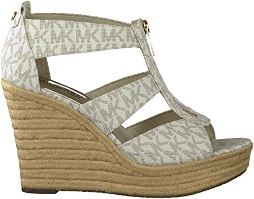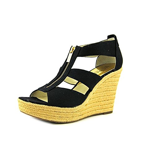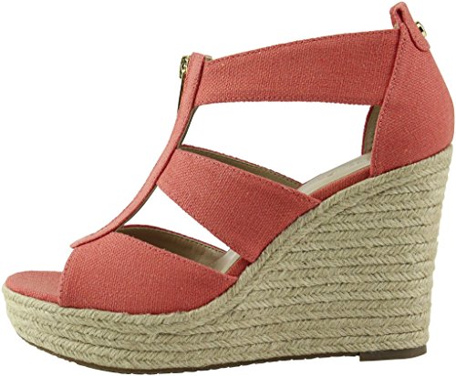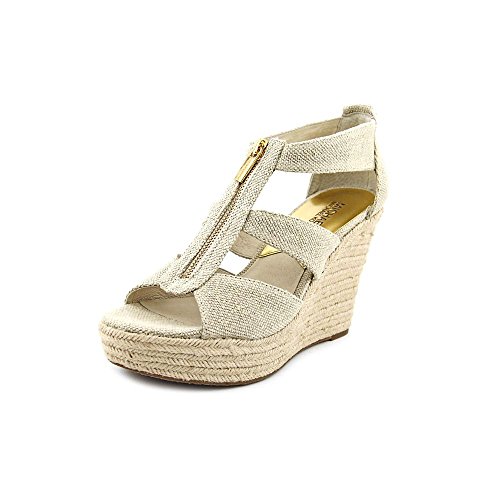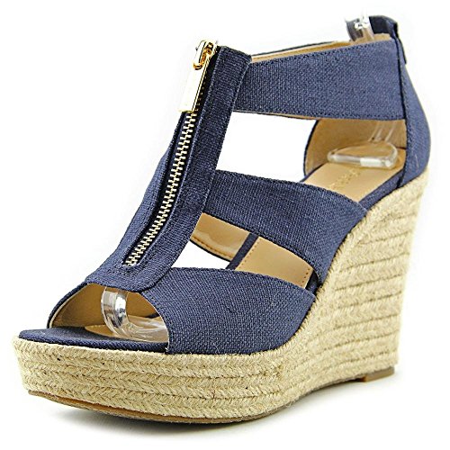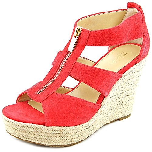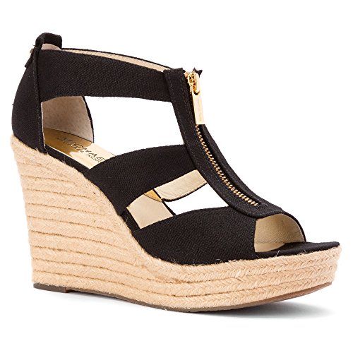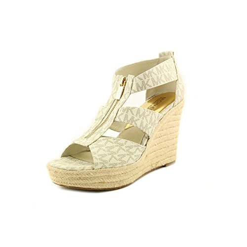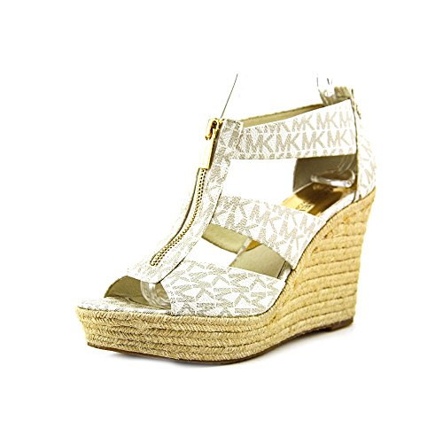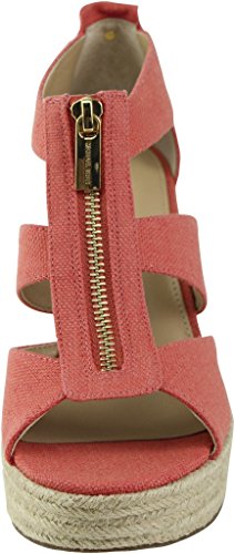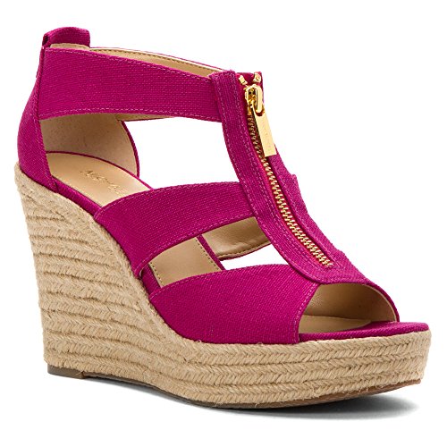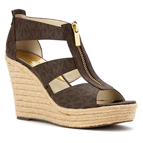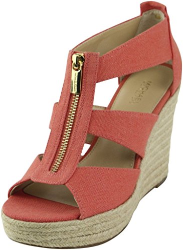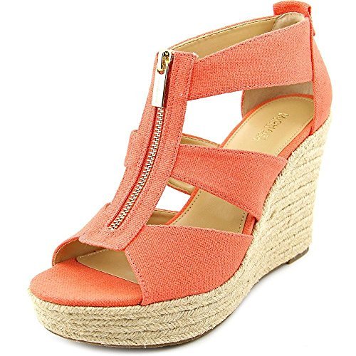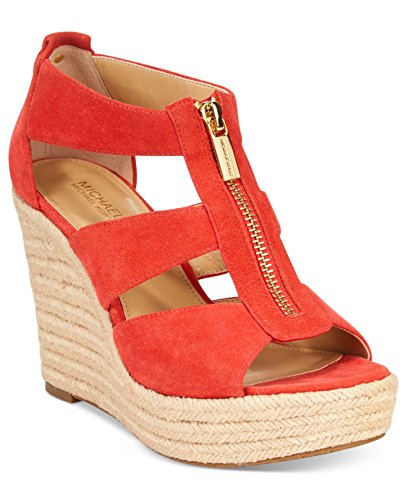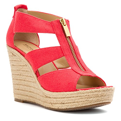 The height of fashion... the Damita platform sandals are the ultimate summer wedge. The heel is the perfect height and the lightweight leather comes in four super cute colors. The zipper detail along the front provides the chic and glamorous touch that MICHAEL Kors is known for. Round open-toe platform wedge sandals with zipper closure on front 3-3/4" espadrille wedge heel, 1" platform, feels like 2-3/4" heel Fabric upper; manmade soleFeature