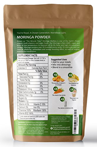 ALL NATURAL MORINGA LEAF POWDER – A natural multivitamin, Moringa has NO side affects. Start with ½ teaspoon upwards to 4 tablespoons per day. Consult a physician with any concerns. Increase slowly to avoid nausea. Not commonly known in the USA, Moringa Oleifera leaf powder will help enhance energy levels, detoxify your body, supports digestion, mental clarity, emotional well-being, balanced blood sugar levels and overall good health.
