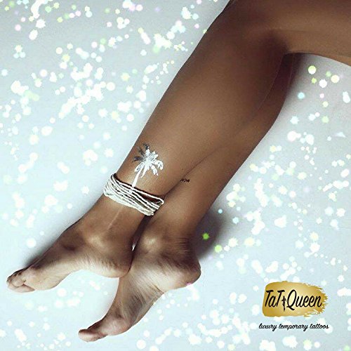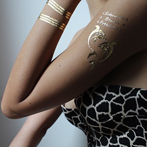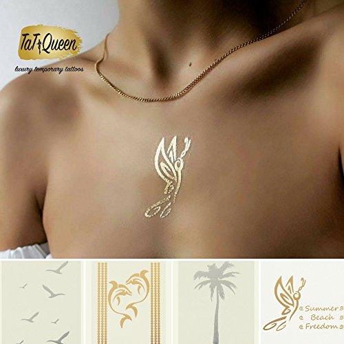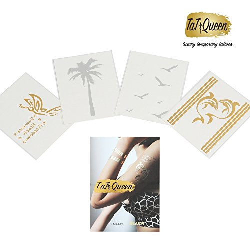 TaT Queen Beach Flash Temporary Metallic Tattoos- Premium Body Paints Art Designer Jewelry Stickers Waterproof & Non Toxic, Great Gift, 4 Sheet Pack (Gold/ Silver)