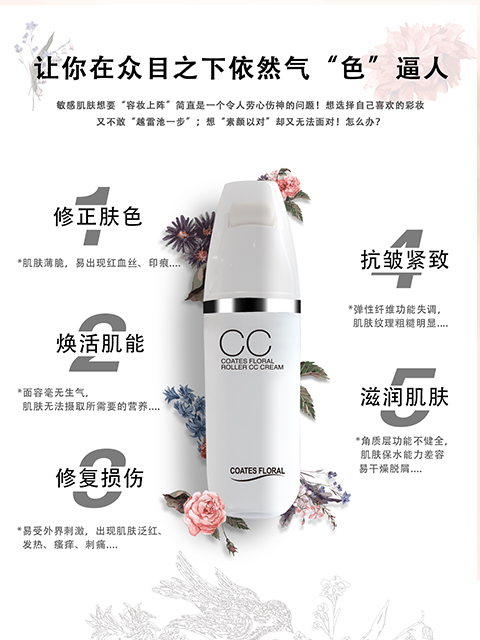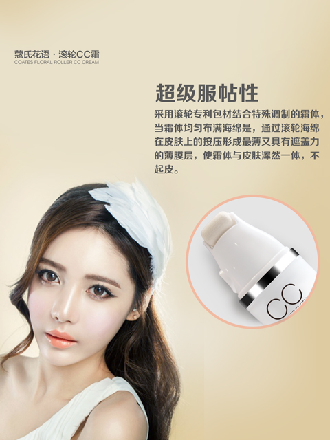 好的平衡,因此蔻氏花语·滚轮CC霜均采用不伤害肌肤的天然成分。从研发到上市,蔻氏花语·滚轮cc霜都经过了很多专业人士的严格测试。采用全新的滚轴设计,具有超强的遮瑕能力,能让CC霜完美地服帖与脸部肌肤,妆感自然清透。