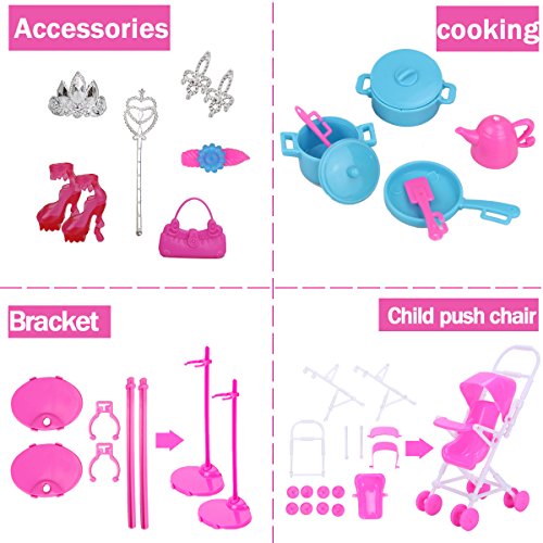 Amount: 19Pcs barbie doll clothes; 98Pcs accessories include accessories, cooking, bracket, child push chair, bike, cart, shoes,kitchen supplies and other small accessories