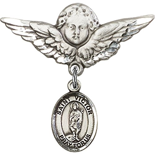 -. Title : Sterling Silver Baby Badge with St. Victor of Marseilles Charm and Angel w/Wings Badge Pin 1 1/8 X 1 1/8 inches