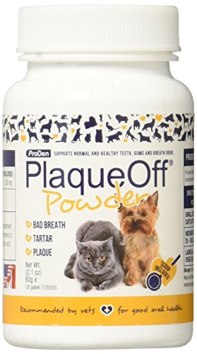 ProDen PlaqueOff animal is an easy way for those dog and cat owners to care for their pet's teeth who don't have the patience or inclination to brush their dog or cat's teeth regularly. The product comes in powdered form and it is simply added on a daily basis to dry or wet food. Dogs and cats like the taste of the small amount that is added. Proden plaqueoff animal does not rely on topical application or friction. The product is ingested and works systemically. Additional Information The natural compound in the product comes out through the saliva and works to break down the bacterial biofilm that forms on the teeth and gums. This is how the natural bacteria in the mouth take hold onto the teeth and gums, colonizing and creating the oral problems of plaque and tartar, bad breathe and gingivitis. It does not change the ph of the mouth or kill off the normal levels of bacteria. Proden plaqueoff has been proven to reduce plaque and tartar on the teeth and gums, depending on composition, diet and how long it has been there. It then works to prevent bad breath, plaque and tartar from returning. Patients generally begin to see results over a 2-8 week period, and will see further benefits with continued use. Proden plaqueoff animal is made from a specific strain of selected seaweed harvested from above scandinavia. This seaweed has developed a natural defensive mechanism against bacterial biofilm. The product is made only from this seaweed and has no additives or chemicals added. It is human grade and human tested.Feature