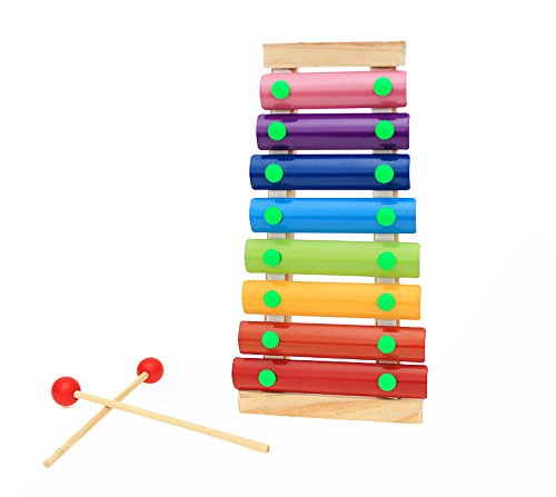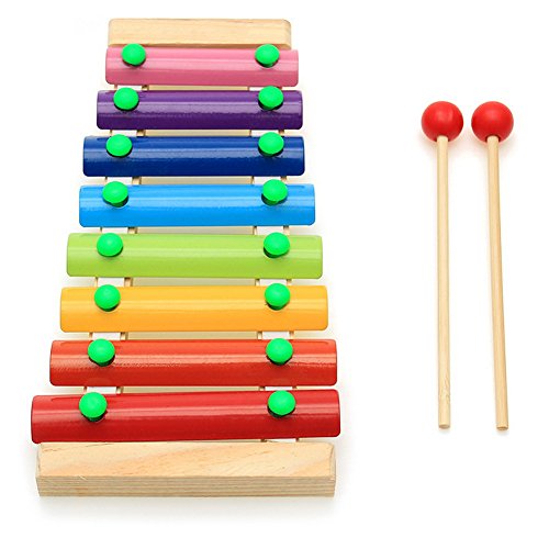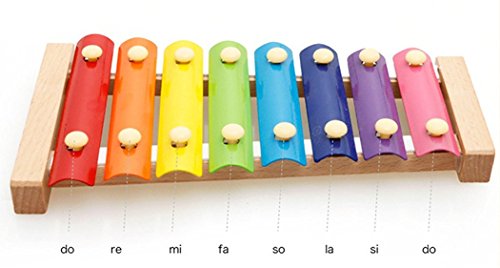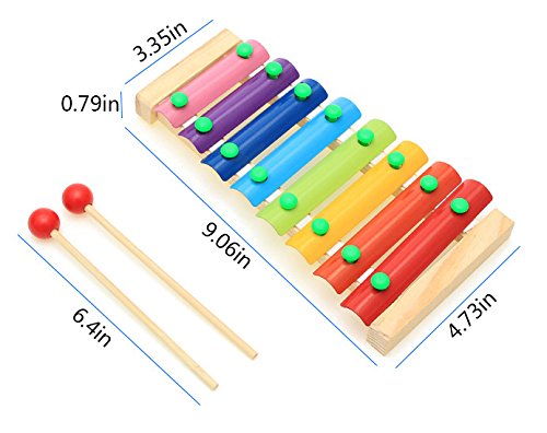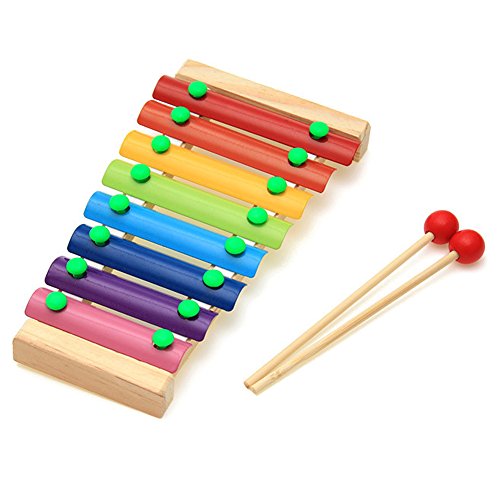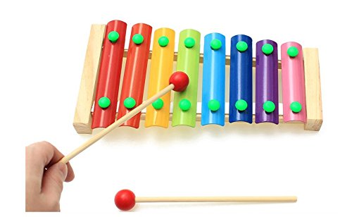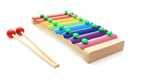 -. Feature : ♫ Wood base xylophone + 8 metal keys + 2 wooden sticks. he xylophone's finishes are BPA Free, Lead Free, Phthalate Free so it's non-toxic and there's no chemical smell. The wood is perfectly smooth and the keys are well attached. / ♫ Play a variety of tones by striking the keys. Let your child learn and enjoy as he creates the most brilliant sounds for you, which can inspire children's talent for music and jumpstart your toddler's musical development.Exercise the children's eye and hand coordination ability. Colorful keyboards can also help child recognize different colors and develop kid's visual ability / ♫ 8 rainbow colored notes, Wooden plus steel, is a big improvement xylophone, the sound is very crisp. With a wooden mallet, you can knock out sweet music / ♫ Enticing to touch and perfect to pitch, smooth rounded edges for safety, great toys for ages 3 years + kids / 100% Money Back Guarantee. There's absolutely no risk to you when you order now! If you aren't completely satisfied, simply contact us and you will get a full product refund.