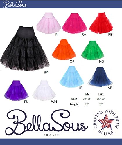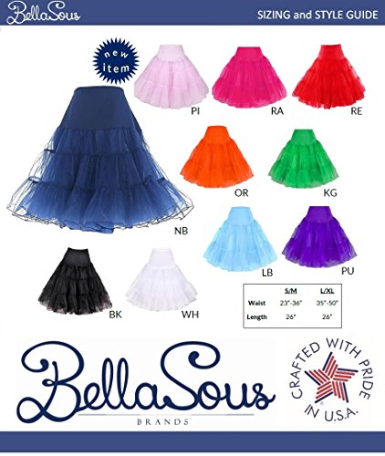 This BellaSous multi layered petticoat skirt (style 418) is perfect for 50s style or vintage looks, poodle skirts, Halloween costumes, or for any party tutu, or concert (dances, raves, EDM, Burning Man)! Use it as a tulle skirt, a red tutu for a princess run, adult dance skirt or adult tutu skirt, princess tutu skirt, or plus size tutu - or pair with your favorite vintage dress or petticoat skirt - the possibilities are endless! The garment is made of soft, fluffy tulle fabric and the waistband stretches generously. Don't be fooled by cheap single-use imports- we offer better quality at the same affodable price. And best of all, our products are 100% made in the U.S.A! Since the 1920's, all BellaSous garments have been built with the quality and durability required by the most discerning customers, and all products are hand-crafted at our facility in Eastern Tennessee. Small / Medium waist stretches from 23 inches (relaxed) to 36 inches (fully stretched) Large / Extra Large waist stretches from 35 inches (relaxed) to 50 inches (fully stretched) Length on all sizes is 26 inches, for a knee length or tea length (depending on your height) look Hand wash warm. No bleach. Drip dry. Available in multiple colors VERY IMPORTANT: Please know that we go to great lengths to ensure the product images are color accurate, but colors display differently on all monitors. Please call or email if you have any questions or concerns before submitting your purchase 0 |