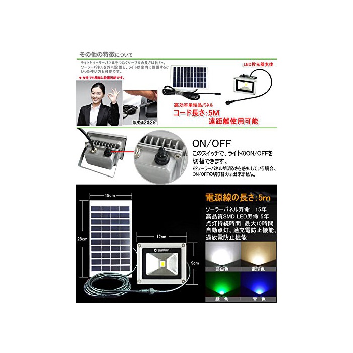 부속품:5m접속 코드,스탠드,일본어 취급 설명서 주의:어두워지면 자동 점등합니다.솔라 패널이 빛을 감지하면,점등 할 수 없습니다.
