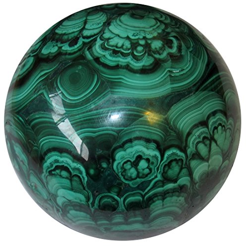 This sphere is made from real malachite of Africa. It boasts lucky green clovers, swirls and hypnotic patterns. The sphere is polished shiny yet retains natural rugged lines, divots, and a rocky white groove.