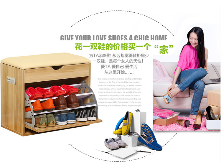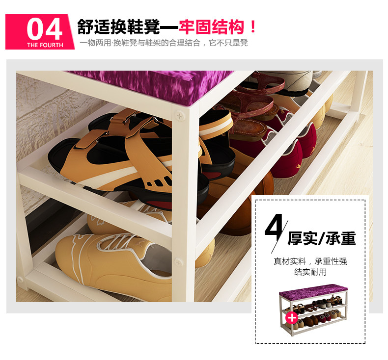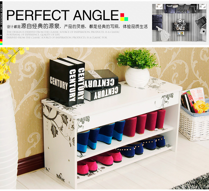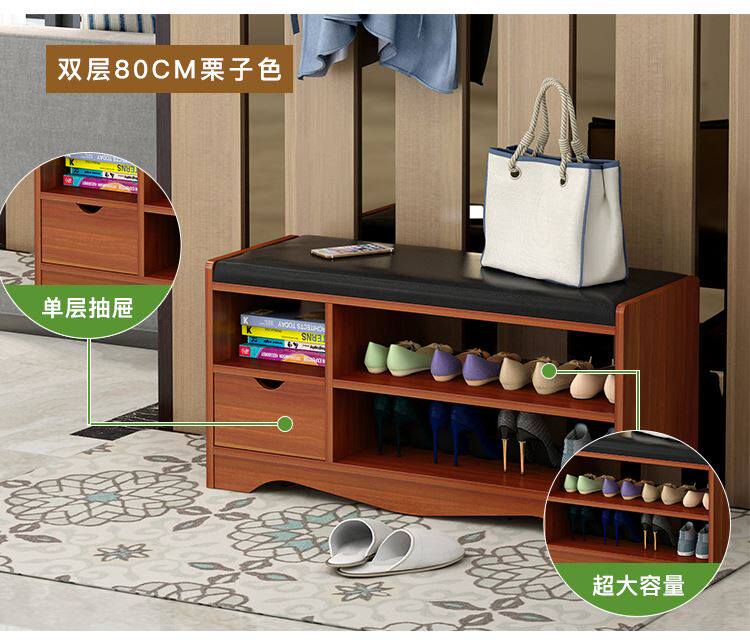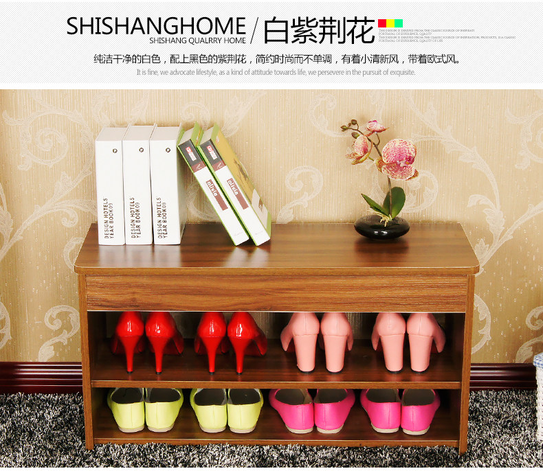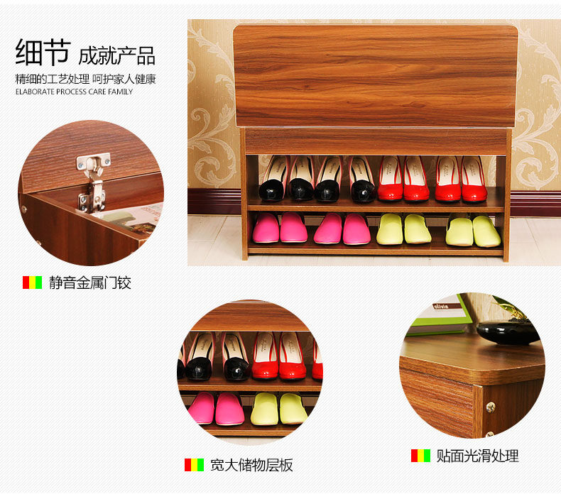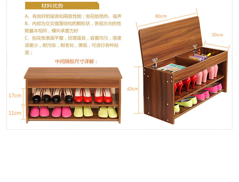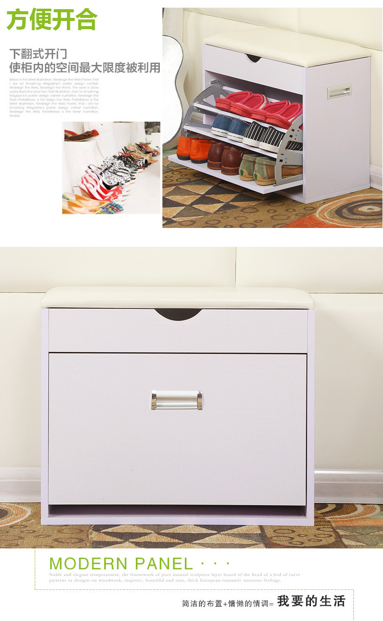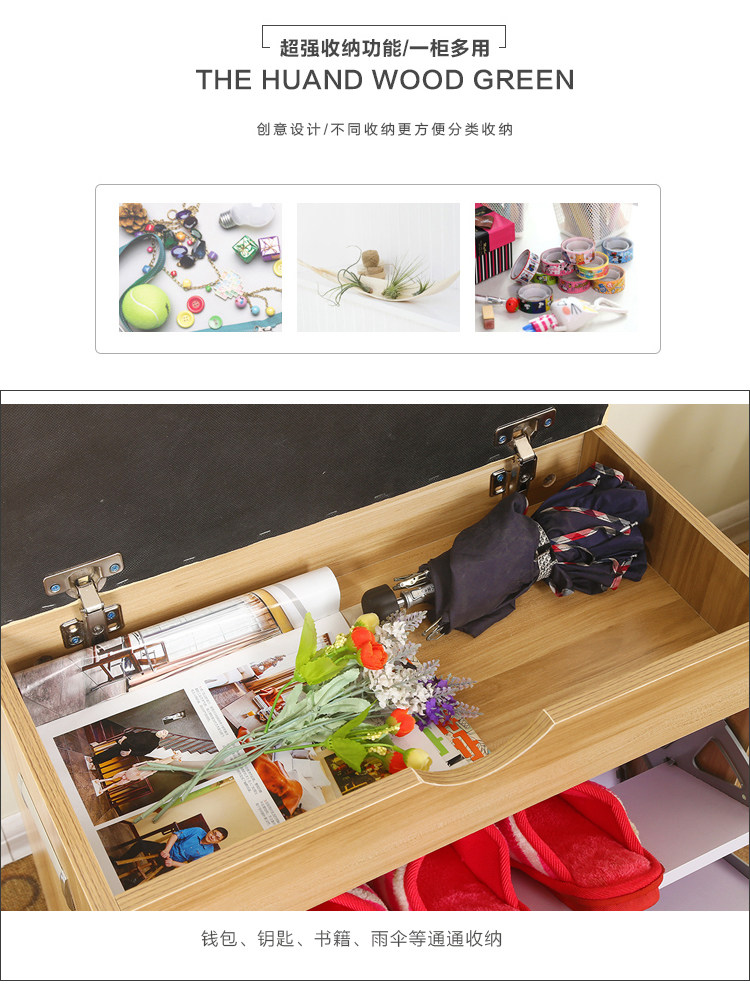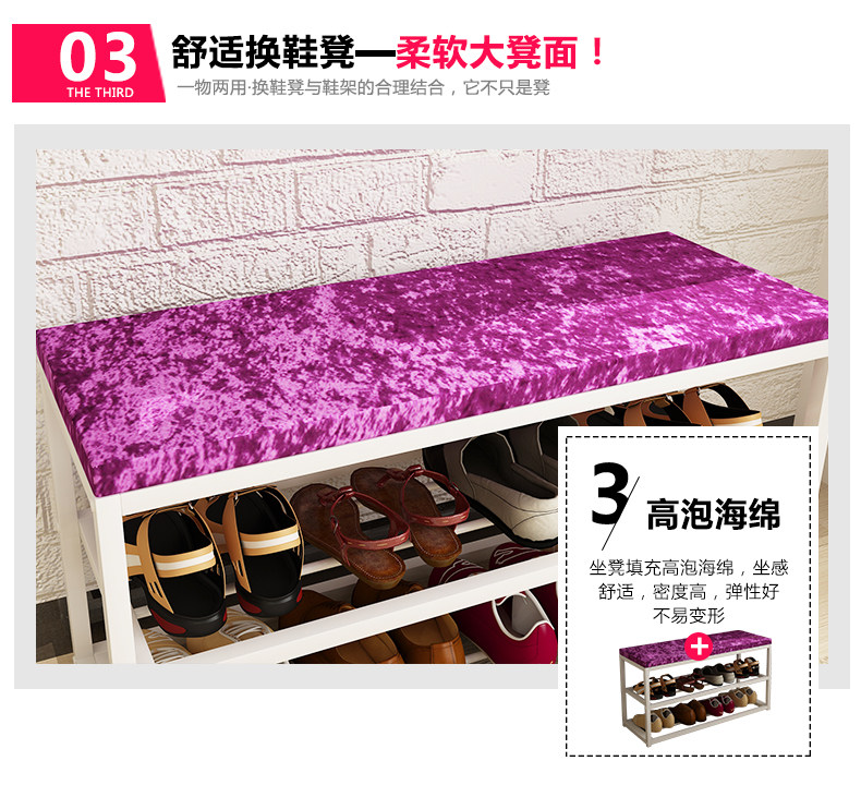 特点:鞋柜与坐凳完美结合, 鞋子收纳井井有条, 也省却了换鞋时" 金鸡独立”的尴尬与麻烦。鞋柜内三层空间, 轻松收纳全家人的鞋子与拖鞋。中间的两块隔板能够自由取出, 空间变大, 较高的鞋子和短靴都能放置进去,大大提升了实用性能。