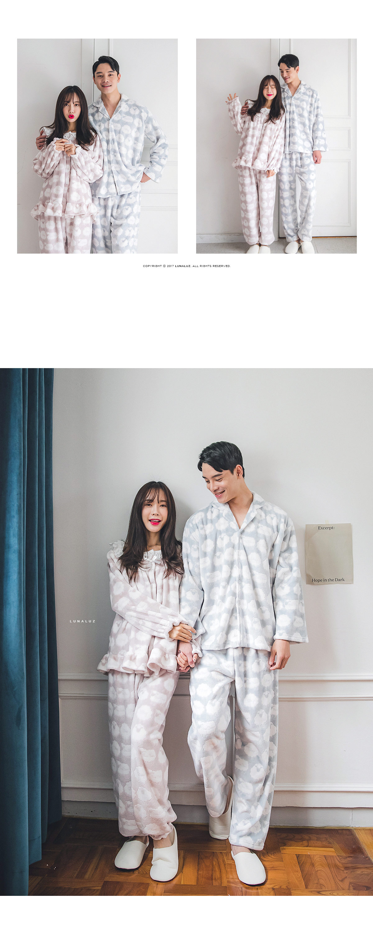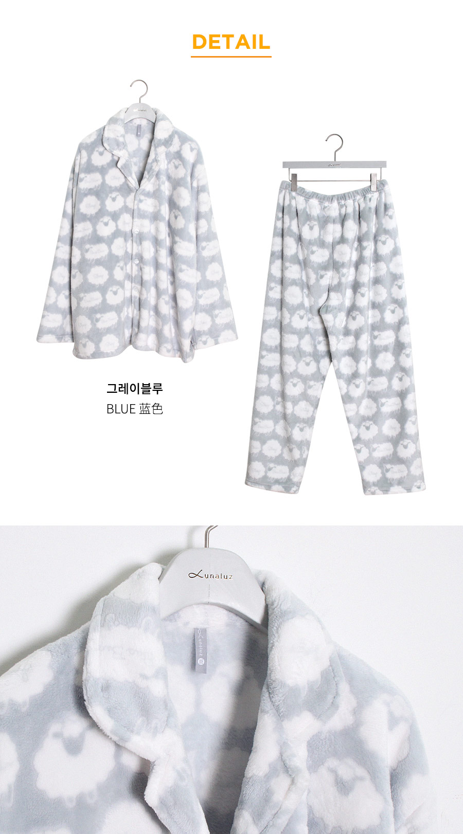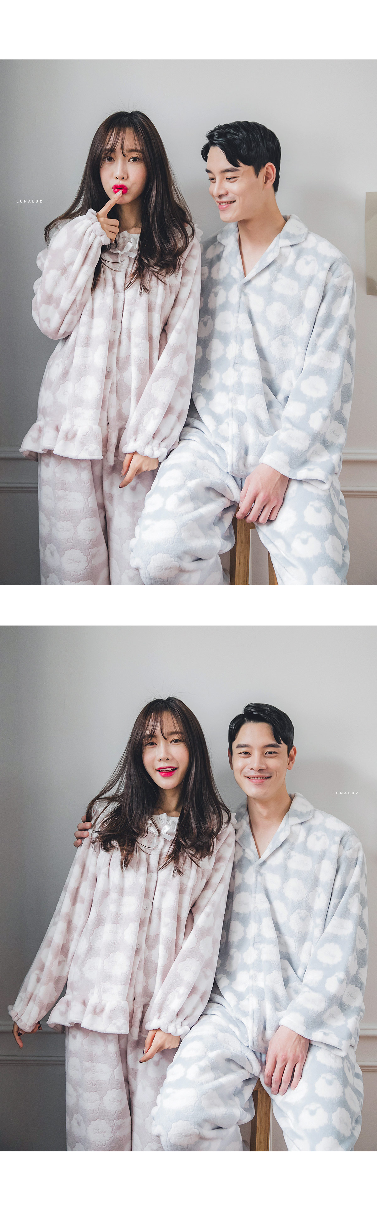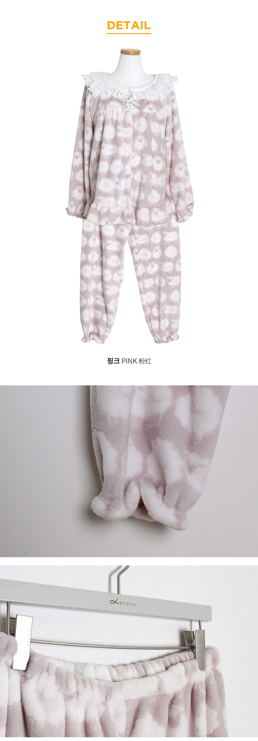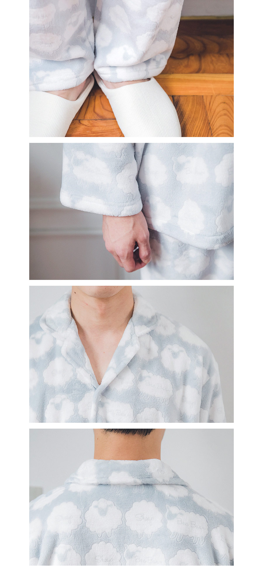 매력적인 소재와 귀여운 모티브가 잘 어우러진 수면 잠옷~! 극세사 원단에 입체감 있는 무늬를 주는 고난이도 기법으로 고급스러운 느낌이 있어 더 매력적인 번아웃 소재의 잠옷이에요. 일반 극세사보다 길이가 길기 때문에 터칭감이 매우 부드럽고 광택 역시 우아하고 고급스러운 윤기를 냅니다. 세탁을 해도 무늬가 변하지 않는 퀄리티 높은 소재입니다. 터칭감이 매끈하고 양면 극세사 원단으로 피부에 닿는 터칭감이 더욱 포근하고, 부드럽습니다. DETAIL여성 잠옷은 편안한 라운드 네크라인 패턴으로 2중으로 면 레이스 장식을 봉제해 포인트를 주었습니다. 어깨라인에서 바스트로 이어지는 레이스 장식이 고급스러움을 더해주는데요. 래글런 패턴을 응용해서 떨어지는 어깨선이 매끄럽고 여리하게 떨어집니다. 전체 오픈형으로 탈 착용이 좋고, 소매에 밴딩 처리를 해주어 활동성을 높여주었습니다. 전체적으로 은은한 고급스러움과 귀여운 분위기가 감도는 잠옷입니다. 남성 잠옷은 깔끔한 카라 잠옷으로 편안하게 연출하기 좋은 스타일의 잠옷입니다. 100% 국내 제작으로 소재, 디자인, 봉제의 퀄리티가 높습니다.