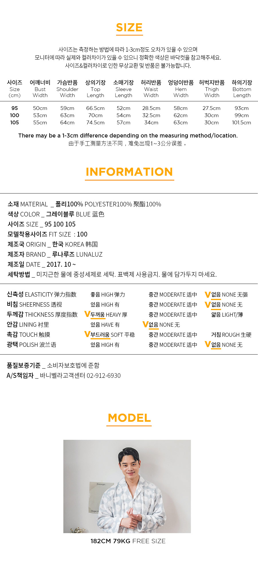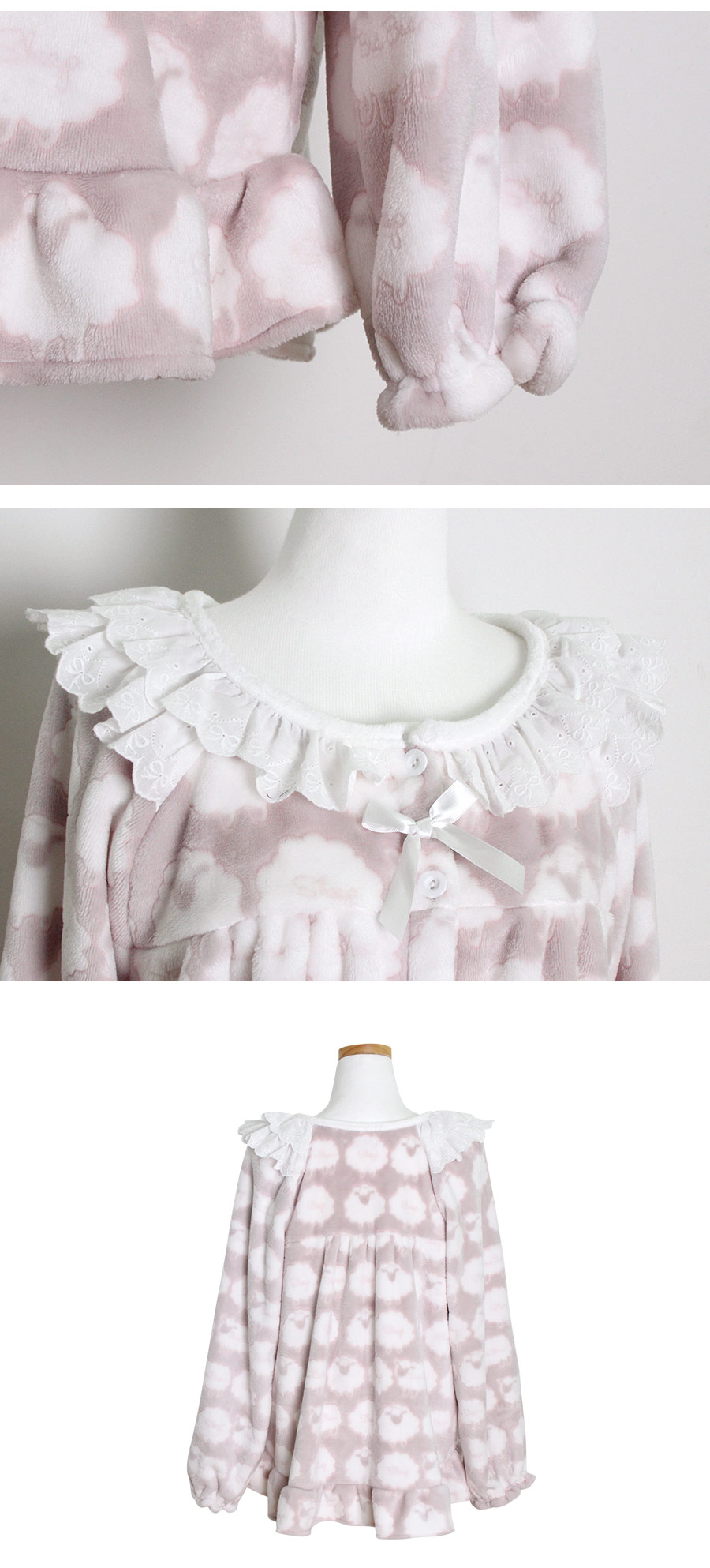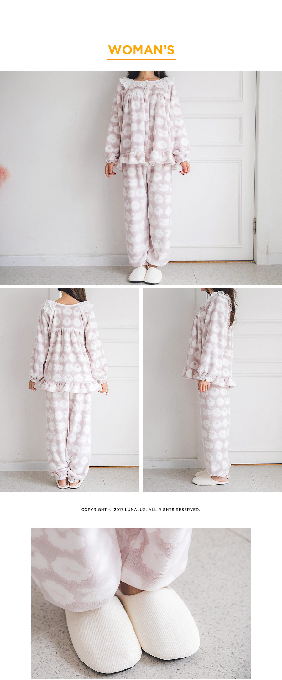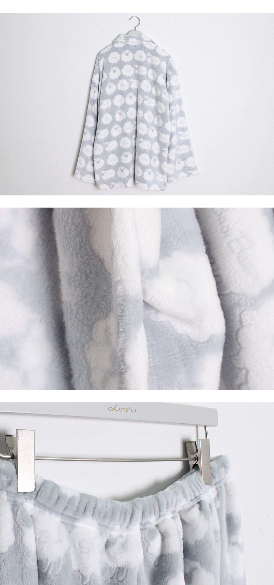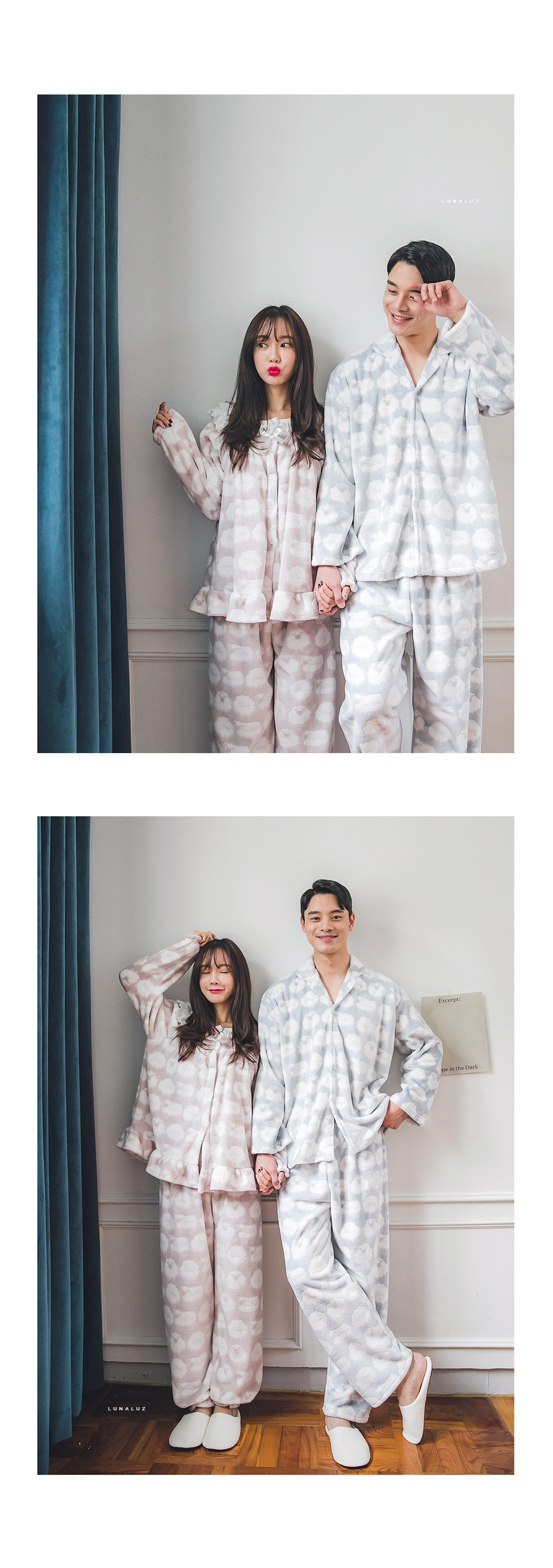 매력적인 소재와 귀여운 모티브가 잘 어우러진 수면 잠옷~! 극세사 원단에 입체감 있는 무늬를 주는 고난이도 기법으로 고급스러운 느낌이 있어 더 매력적인 번아웃 소재의 잠옷이에요. 일반 극세사보다 길이가 길기 때문에 터칭감이 매우 부드럽고 광택 역시 우아하고 고급스러운 윤기를 냅니다. 세탁을 해도 무늬가 변하지 않는 퀄리티 높은 소재입니다. 터칭감이 매끈하고 양면 극세사 원단으로 피부에 닿는 터칭감이 더욱 포근하고, 부드럽습니다. DETAIL여성 잠옷은 편안한 라운드 네크라인 패턴으로 2중으로 면 레이스 장식을 봉제해 포인트를 주었습니다. 어깨라인에서 바스트로 이어지는 레이스 장식이 고급스러움을 더해주는데요. 래글런 패턴을 응용해서 떨어지는 어깨선이 매끄럽고 여리하게 떨어집니다. 전체 오픈형으로 탈 착용이 좋고, 소매에 밴딩 처리를 해주어 활동성을 높여주었습니다. 전체적으로 은은한 고급스러움과 귀여운 분위기가 감도는 잠옷입니다. 남성 잠옷은 깔끔한 카라 잠옷으로 편안하게 연출하기 좋은 스타일의 잠옷입니다. 100% 국내 제작으로 소재, 디자인, 봉제의 퀄리티가 높습니다.