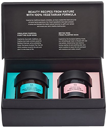 -. Binding : Health and Beauty -. Brand : The Body Shop -. EAN : 7105307248933 -. Feature : This 100% vegetarian duo of expert facial masks is the perfect indulgence to a give your loved one a taste of the finest ingredients from around the world / Himalayan Charcoal Purifying Glow Mask 80ml: draws out impurities and reveals healthy-looking glow / British Rose Fresh Plumping Mask 80ml: replenishes skin with moisture and reveals visibly smooth skin -. IsAdultProduct : 0 -. Label : Buth-na-Bodhaige Inc, d/b/a The Body Shop -. Manufacturer : Buth-na-Bodhaige Inc, d/b/a The Body Shop -. Model : No Model -. MPN : 1054535 -. NumberOfItems : 1 -. PackageQuantity : 1 -. PartNumber : 1054535 -. ProductGroup : Beauty -. ProductTypeName : BEAUTY -. PublicationDate : 2016-08-05 -. Publisher : Buth-na-Bodhaige Inc, d/b/a The Body Shop -. ReleaseDate : 2016-08-22 -. Studio : Buth-na-Bodhaige Inc, d/b/a The Body Shop -. Title : The Body Shop The Finest Facial Mask Duo Gift Set