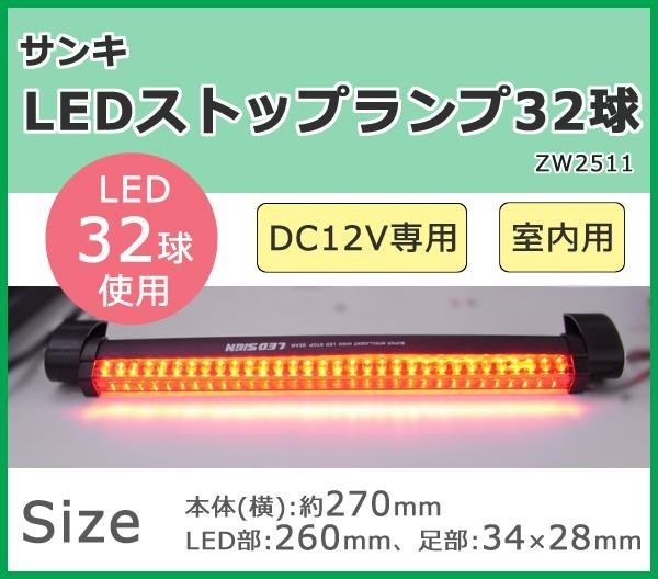 LEDを32個採用した室内用ストップランプです。両面テープで貼り付けできます。 製造国:中国 素材・材質:合成樹脂 商品サイズ:本体(横):約270mm、LED部:260mm、足部:34×28mm 仕様:DC12V専用LED32球室内用コード長:45cm ※サプライヤー直送品 ご注文後7~8営業日後の出荷となります【商品名】サンキ LEDストップランプ32球 ZW2511