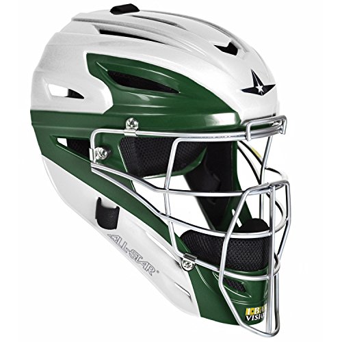 Studio : All-Star Publisher : All-Star Binding : Misc. Product Description The All-Star System Seven White Two-Tone catcher's helmet features an I-bar vision steel cage, a high impact resistant ABS plastic shell with increased forehead thickness, a backplate designed to keep the snaps on, and a breathable machine washable 3D mesh padding liner. The bars on the cage around the eye openings are flatter for increased range of view and to make the bars stronger. Instead of using a round steel wire, the I-bar vision cages utilize a flat bar which is comparable to an I-beam used in building construction. - Adult fits head sizes 7 to 7 1/2 - I-Bar Vision steel cage - High impact resistant ABS plastic shell - Meets NOCSAE standard - SEI Certified - Machine washable liner - Weighs 45.2 oz 0