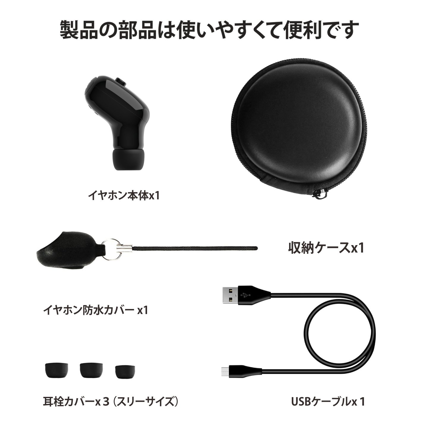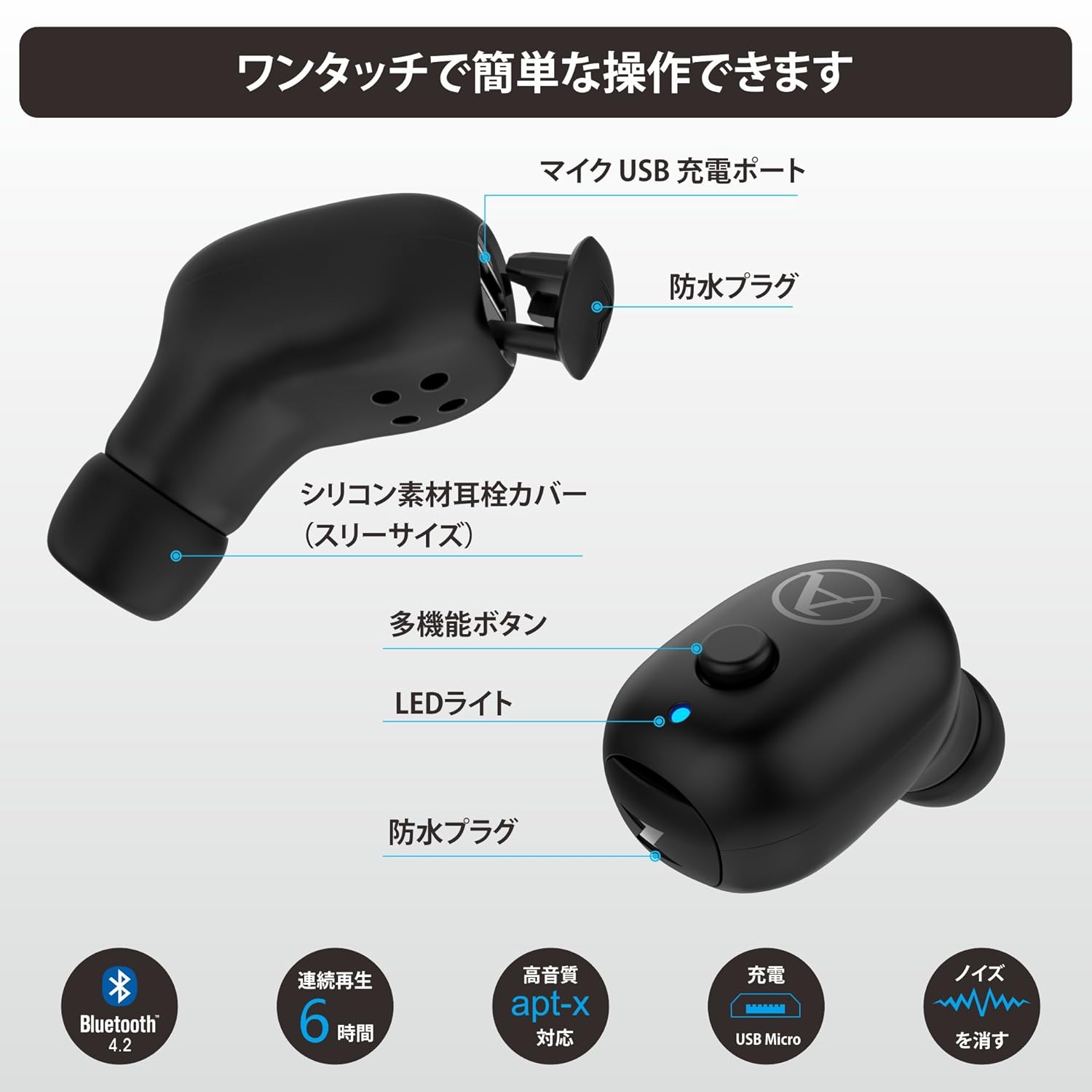 【超小型&コンパクトなデザイン】本製品はサイズが2.0*1.5*1.2cmで、重量が4.5g。コンパクトで軽く、快適に装着できますので、長時間で耳に入れても耳に圧迫感を与えません。ウンボタンのデザインで音楽再生/停止、通話/終了など、簡単にコントロールできます。ランニングにもスケートにも、さまざまな動きに対応し、脱落することを心配する必要はありません。どこでも楽に使えます。