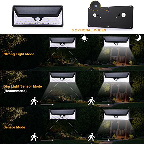 - 3 MODES FOR VERSATILE USE: Equipped with a motion sensor, the lighting array allows for a multitude of uses, including as a security light. The strong light mode is best-suited for front and back doors, outdoor patio areas and backyard decking areas etc. The dim light sensor mode is suited for balcony railing, side of buildings, pathways and entrances etc. The sensor mode is well-suited for areas where you only need light when something is approaching; i.e. a garage door, driveway or gate etc.
