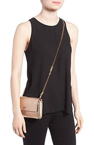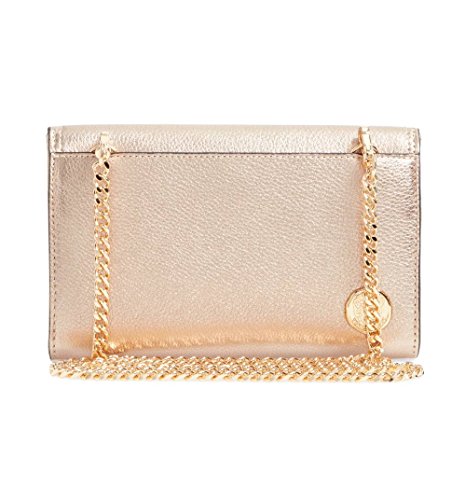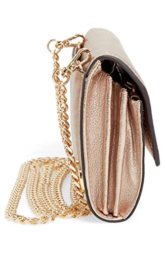 Pebbled leather shiny crossbody wallet with a gleaming chain strap.