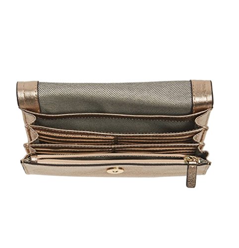Interior zip, wall and currency pockets; 12 card slots