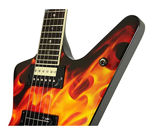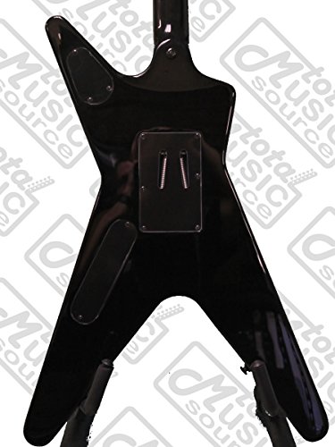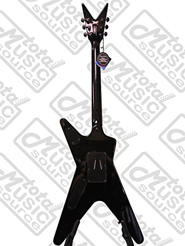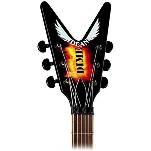 | Dean Humbuckers, Licensed Floyd Rose Tremolo bridge. | Get your (headstock) wings. | Dime It The late great Dimebag Darrell is a serious metal guitar hero, and Dean's series of Dimebag models pays homage. Dimebag started playing Dean ML style guitars in the late '70s, and made it one of the most recognizable shapes today. Dean offers a wide variety of Dimebag MLs to choose from, all boasting Dimebag's distinctive look and tons of mojo and attitude. Mahogany Body As with the original models, Dean uses a mahogany body for this ML. Mahogany is a common choice for electrics, dependably delivering a warm, full tone with plenty of punch and sustain. The flame graphics, from which the axe gets its name, should help inspire you to light the fretboard on fire. Set Neck Construction The Dime-o-Flame ML features a set mahogany neck, which imparts all the well-known advantages of that style: a warmer overall tone with extended low-end response, wicked sustain, and easy upper-fret access (enhanced even further by the cutaways). The 24-3/4-inch scale neck features a rosewood fingerboard with dot inlays. Seymour Duncan Dimebucker Bridge Pickup Seymour's SH-13 Dimebuckers were designed with the man himself to provide serious output and an aggressive tone. The Dimebucker uses a powerful ceramic magnet and stainless steel blades for serious crunch. The SH-13 boasts more treble bite than a lot of humbuckers, along with low-end punch and exceptional dynamics. A Dean humbucker completes the package up in the neck position, each pickup getting its own volume conrol, along with a shared tone and three-way toggle. Grover Tuners If you play guitar then you know what this means--solid, dependable tuning from the industry standard. These guitar machines are a triumph in engineering and style, with a gear ratio of 14:1, perfect gear meshing, and zero backlash and slippage. The gear box has a special lubricant for lifetime, trouble-free service. Licensed Floyd Rose Tremolo The patented and often imitated double-locking design of the Floyd Rose tremolo allows you to lock your guitar in tune at the nut and at the bridge. Engineered like no other tremolo system, the Floyd's high-quality steel parts are manufactured to exacting specifications. Beat it up as much as you want--from traditional vibrato to dive bombing leads or flapping loose strings, and stay in tune while you do it. DBD Traction Knobs Dimebag always rocked his "traction knobs," which he created by taking a soldering iron to them, for knobs that are grippable no matter how much sweat's pouring off you on stage. Dean faithfully recreates that here.