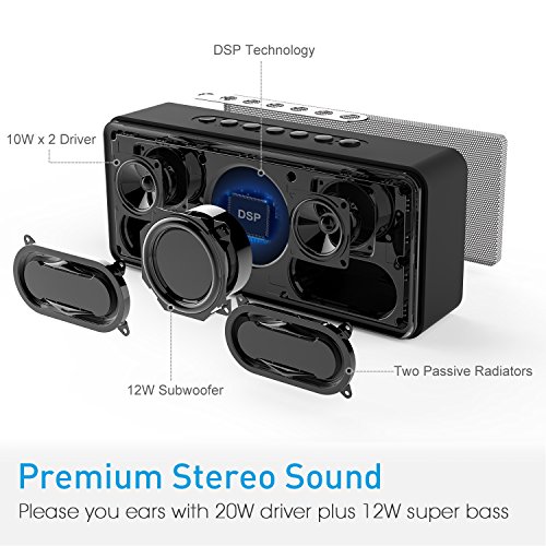 Clear Stereo Sound: Strong 20W driver, 12W Subwoofer, 2×passive radiators and DSP technology get it right to pleasing ears with solid, abundant sound. Expansive soundstage is powerful enough to fill any room.