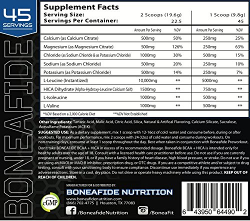 Studio : Manufactured for Boneafide Nutrtition Publisher : Manufactured for Boneafide Nutrtition Binding : Health and Beauty Product Description Boneafide BCAA HICA is loaded with 10 Grams of Leucine and 1500 Milligrams of HICA. There is no other BCAA like this on the market, Not only do we list out every ingredient without any hidden blends, we are cGMP certified so you know that quality is our top priority. BCAA supplementation can promote muscle protein synthesis and increase muscle growth over time. HICA, also known as Leucic acid, is a metabolite of Leucine that has anabolic properties. Combining Leucine and HICA peri-workout allows for high intensity workouts prolonging fatigue ensuring sustained and high powered workouts. 0