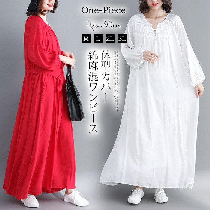 ■【キーワード】ワンピース 秋 ロング丈ワンピース 長袖 秋ワンピース マキシワンピース ロング丈 ロング ゆったり 体型カバー 綿 リネン コットンリネン 大きいサイズ 着痩せ シャツワンピース 30代 40代 50代 お洒落 おしゃれ オシャレ トップス チュニック ワンピース ゆるっと 旅行 ママワンピース 母親 ママ ワンピース 2L 3L■【point】・ふんわりラインで体型カバーは抜群!!・春秋冬を中心に活躍する落ち感のあるしなやかな布帛生地を使用し、軽やかに仕立てました。★カラー:白、赤★裏地:あり★サイズM:着丈125 バスト104 袖丈54 L:着丈126 バスト108 袖丈55 XL:着丈127 バスト112 袖丈56 2XL:着丈128 バスト116 袖丈57【ご注意】:初めのうち色落ちする事がありますので他のものとは別にお洗いください。・塩素系漂白剤は使用しないでください。